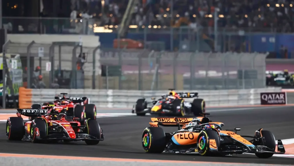 أوسكار بياستري في ماكلارين MCL60، يتقدم على جورج راسل الذي يقود مرسيدس F1 W14 وكارلوس ساينز الذي يقود فيراري SF-23، وبقية السيارات.