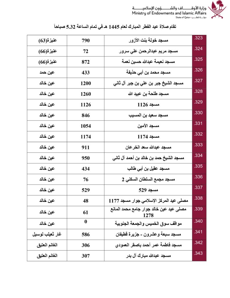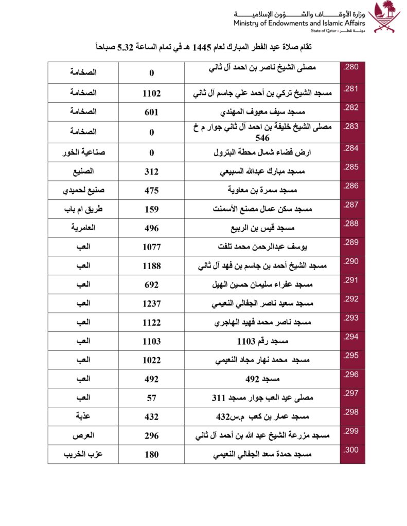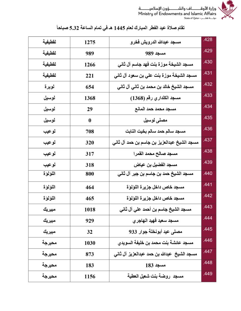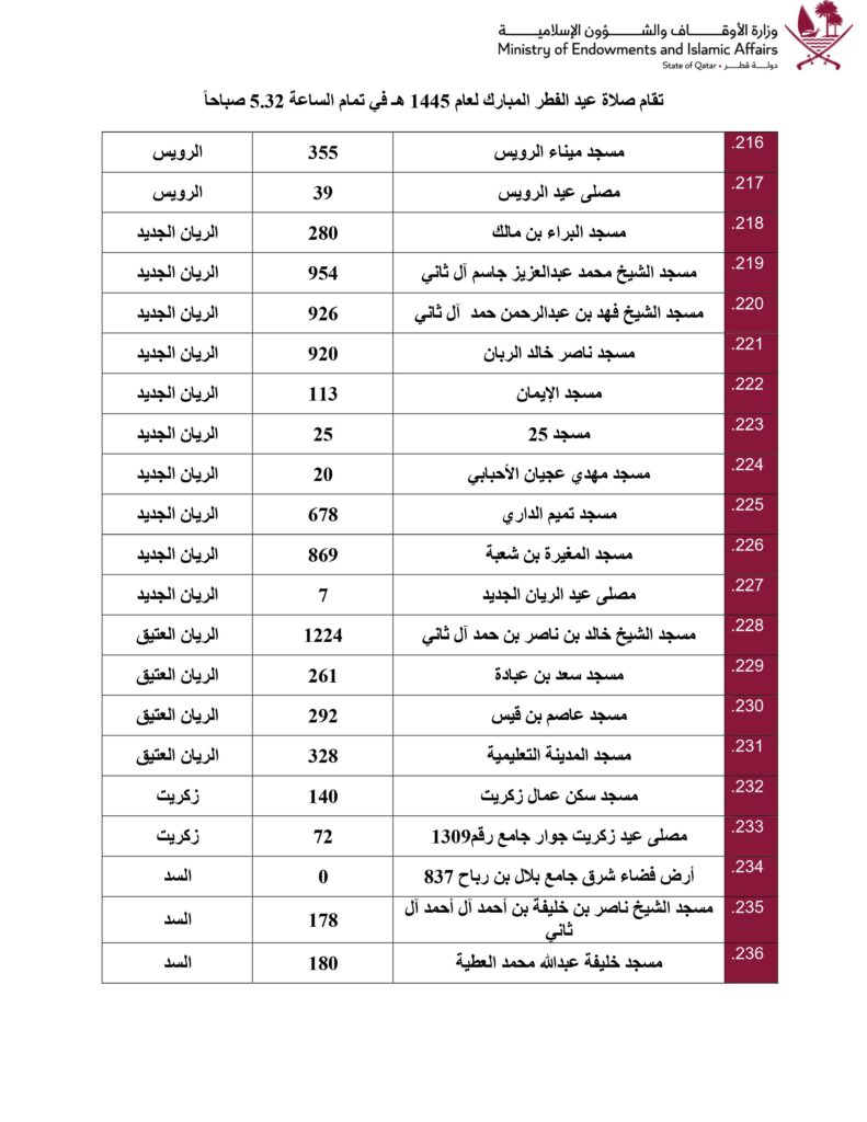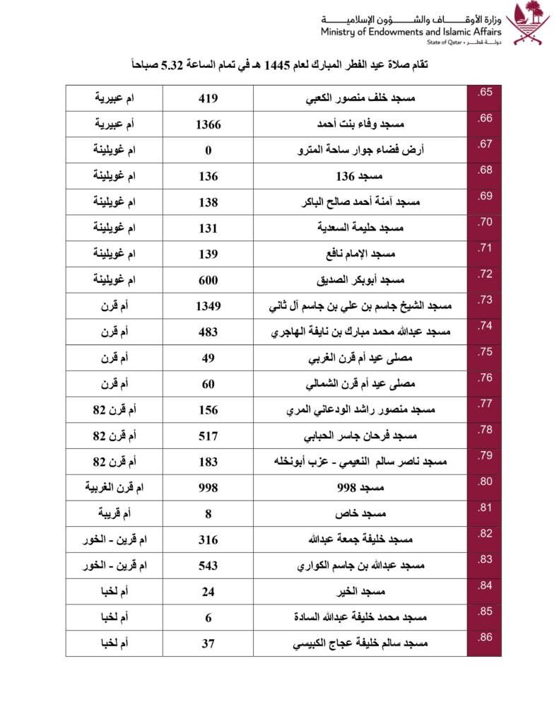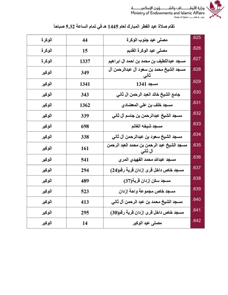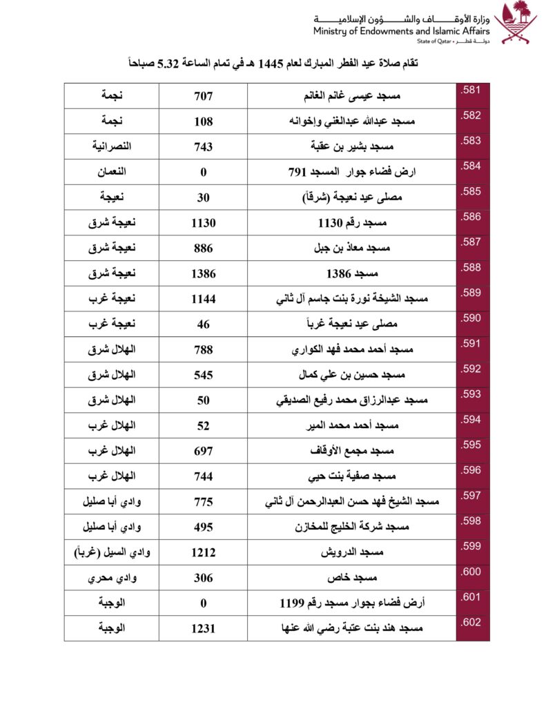 كشفت وزارة الأوقاف والشؤون الإسلامية (الأوقاف) عن القائمة الشاملة للمساجد والمصليات التي ستُقام فيها صلاة عيد الفطر هذا العام. وقد خُصِّصَ 642 موقعاً في جميع أنحاء قطر لهذه الصلاة الخاصة، والتي من المقرر أن تقام في الساعة 5:32 صباحًا وفقًا لإعلان الوزارة.