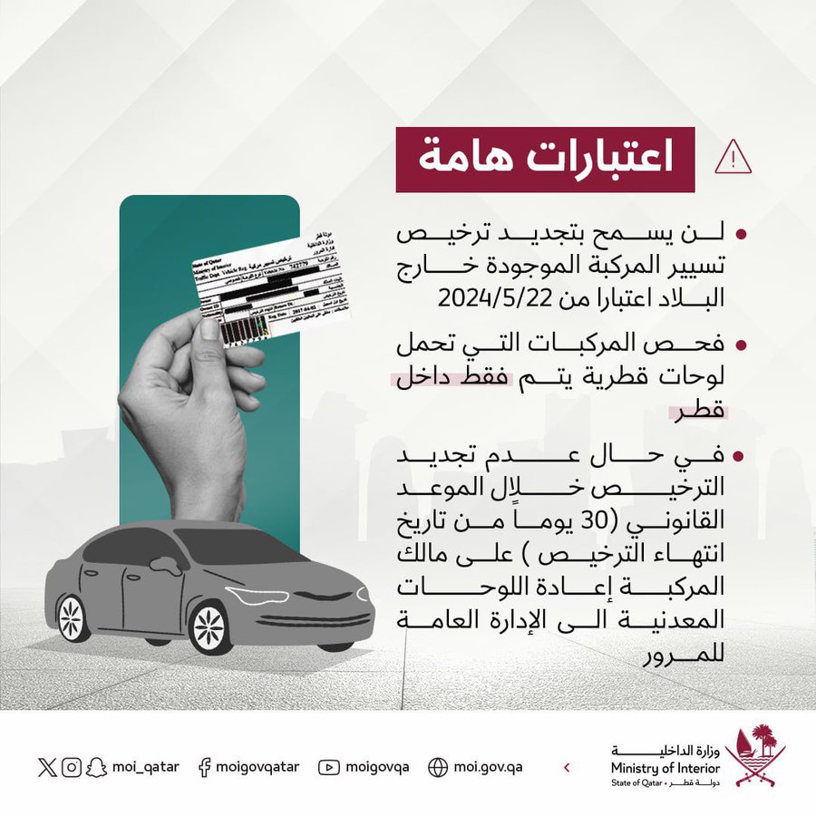 اعتباراً من تاريخ هذا الإعلان، لن يُسمح للسيارات الموجودة خارج الدولة بتجديد تسجيلها إلا إذا خضعت المركبة لفحص فني داخل البلاد. إذا لم يتم تجديد التسجيل خلال المدة القانونية (30 يوماً من تاريخ انتهاء الصلاحية)، يجب على مالك المركبة إعادة اللوحات إلى الإدارة العامة للمرور.