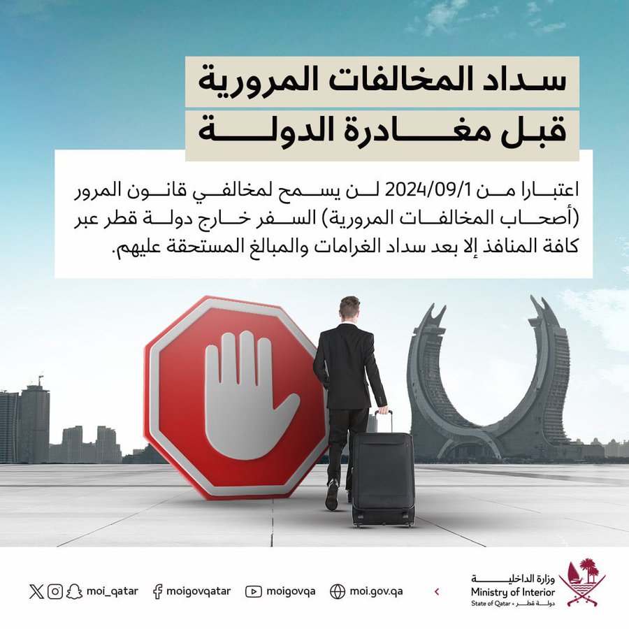 اعتبارًا من 01 سبتمبر 2024، لن يُسمح لمخالفي قانون المرور بالسفر خارج الدولة عبر كافة منافذ الدولة (البرية، الجوية، البحرية) دون دفع الغرامات والمستحقات من خلال تطبيق (مطراش2) أو موقع وزارة الداخلية أو أقسام المرور أو مراكز الخدمة الموحدة.