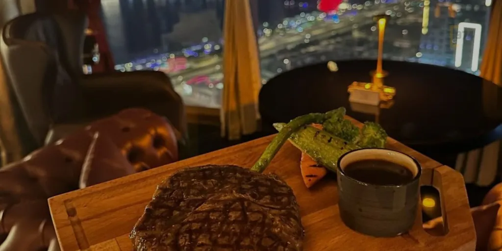 يقدم مطعم نايف تجربة تناول شرائح اللحم مع منظر مبهر على أفق مدينة لوسيل.